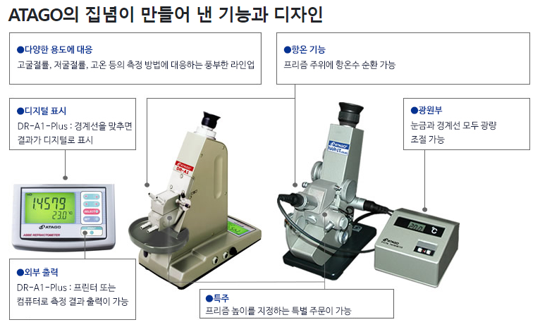 - Digital 온도계 부착되어 있으며 액체 심플 투명도가 낮은 유리 플라스틱필름 등의 굴절률 측정도 가능합니다.