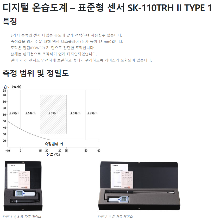 | 측정 정밀도 | 온도: ±0.5 ˚C(15 ~ 35 ˚C) / 기타: ±1 ˚C 습도: 아래 그림 참조 | ||||||