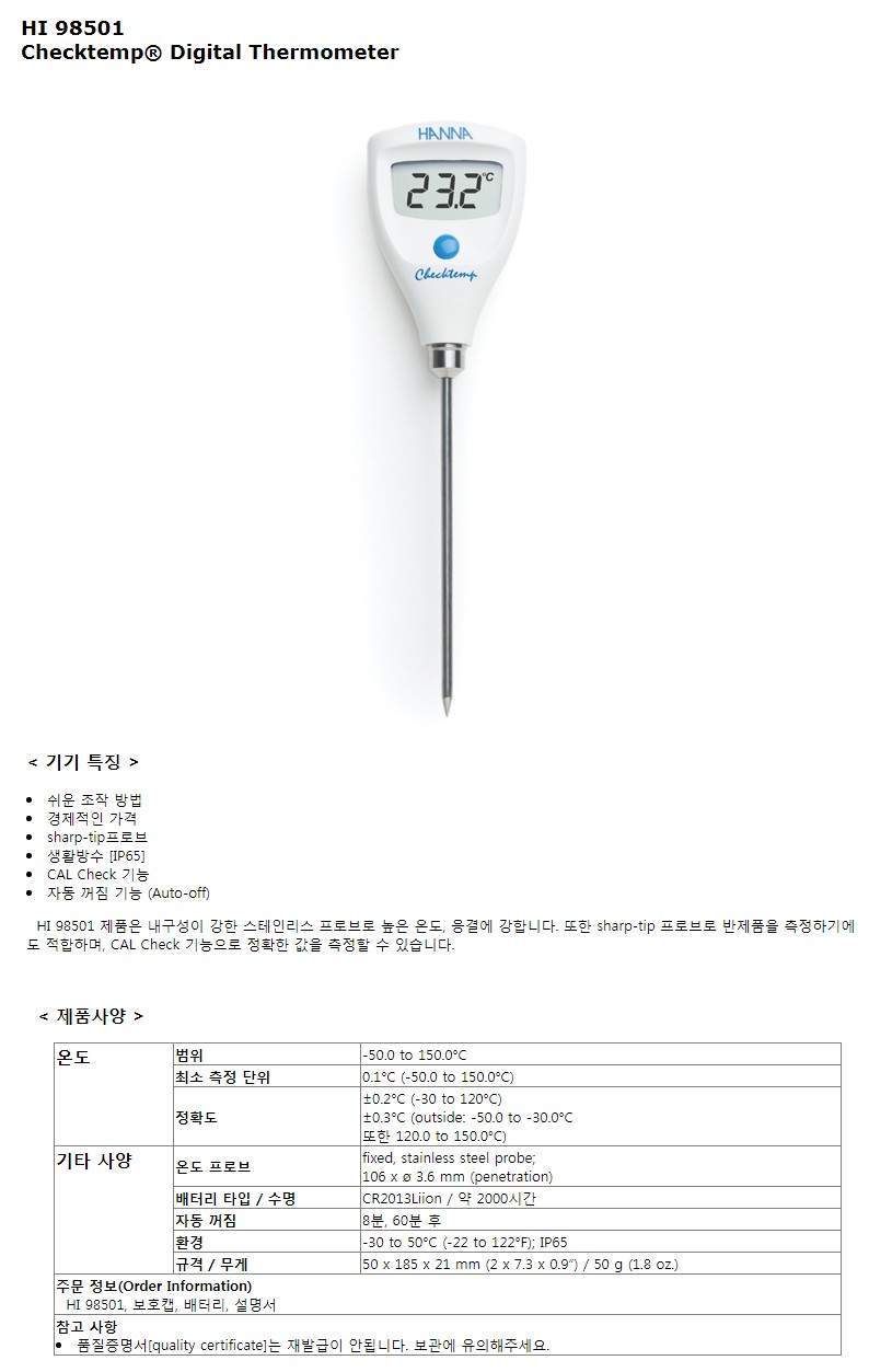 HANNA HI 98501 휴대용 디지털 탐침 온도계