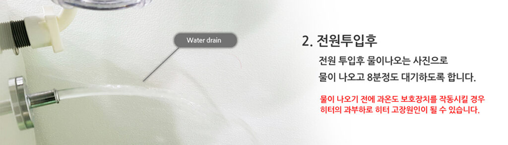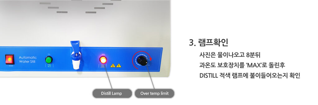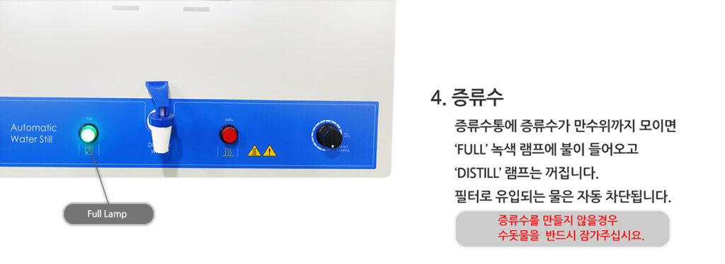 또한 사용자가 별다른 조작이 없이 기기의 동작 유무를 확인할 수 있는 만수 및 증류 램프가 있으며 과열 방지 센서가 내장되어 안전하게 사용할 수 있습니다.